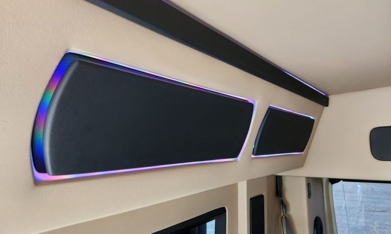 - Finishes & Lighting: Premium Wood Grain Flooring • Sound / Heat Insulation • Rear Privacy Window Shades • Indirect LED Accent Lighting • LED Reading Lights • Stainless Steel Cupholders