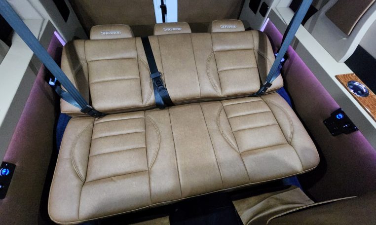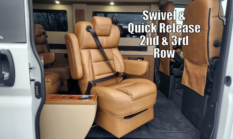 - Seating Layout: Premium Leather Seating • Swivel/Quick-Release 2nd & 3rd Row Captain Chairs • 2-Section Power Sofa/Bed